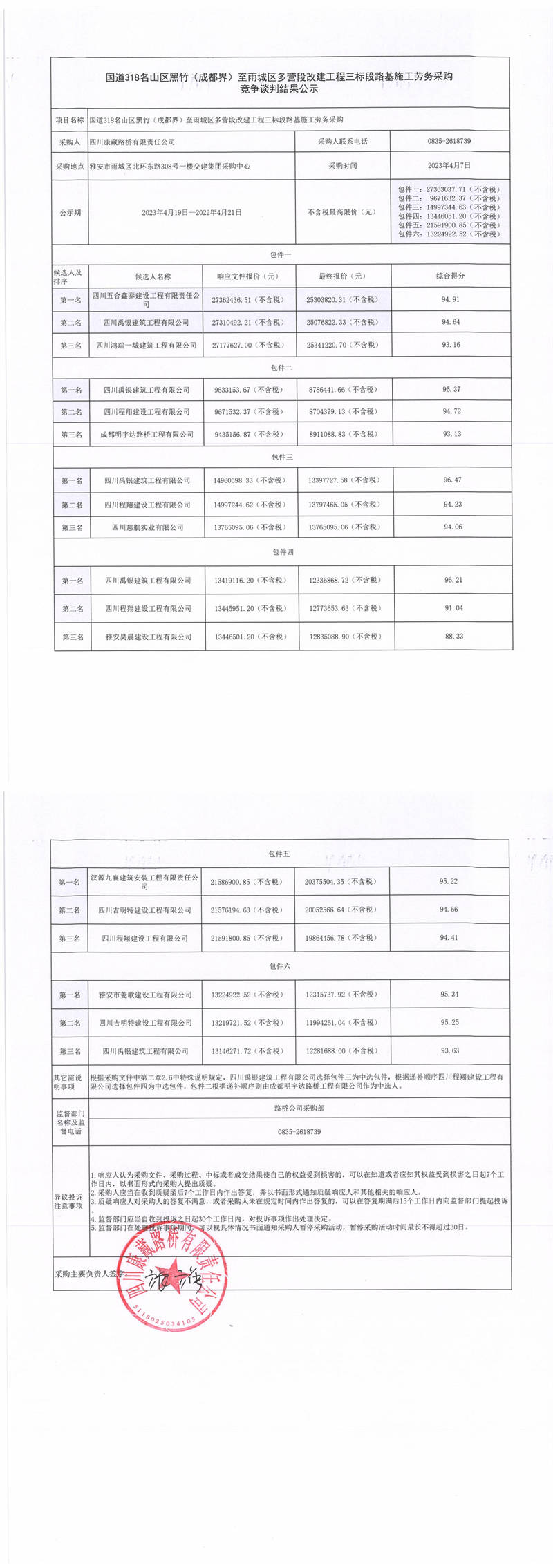 四川康藏路橋有限責(zé)任公司國(guó)道318名山區(qū)黑竹(成都界)至雨城區(qū)多營(yíng)段改建工程三標(biāo)段橋梁施工勞務(wù)采購(gòu)競(jìng)爭(zhēng)談判結(jié)果公示