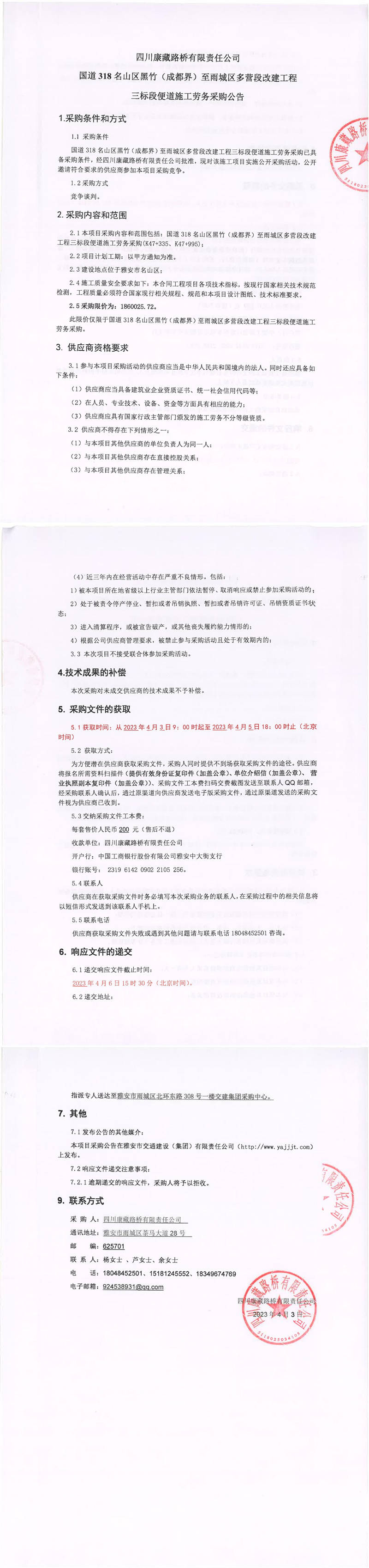 四川康藏路橋有限責任公司國道318名山區(qū)黑竹(成都界)至雨城區(qū)多營段改建工程三標段橋梁施工勞務采購公告