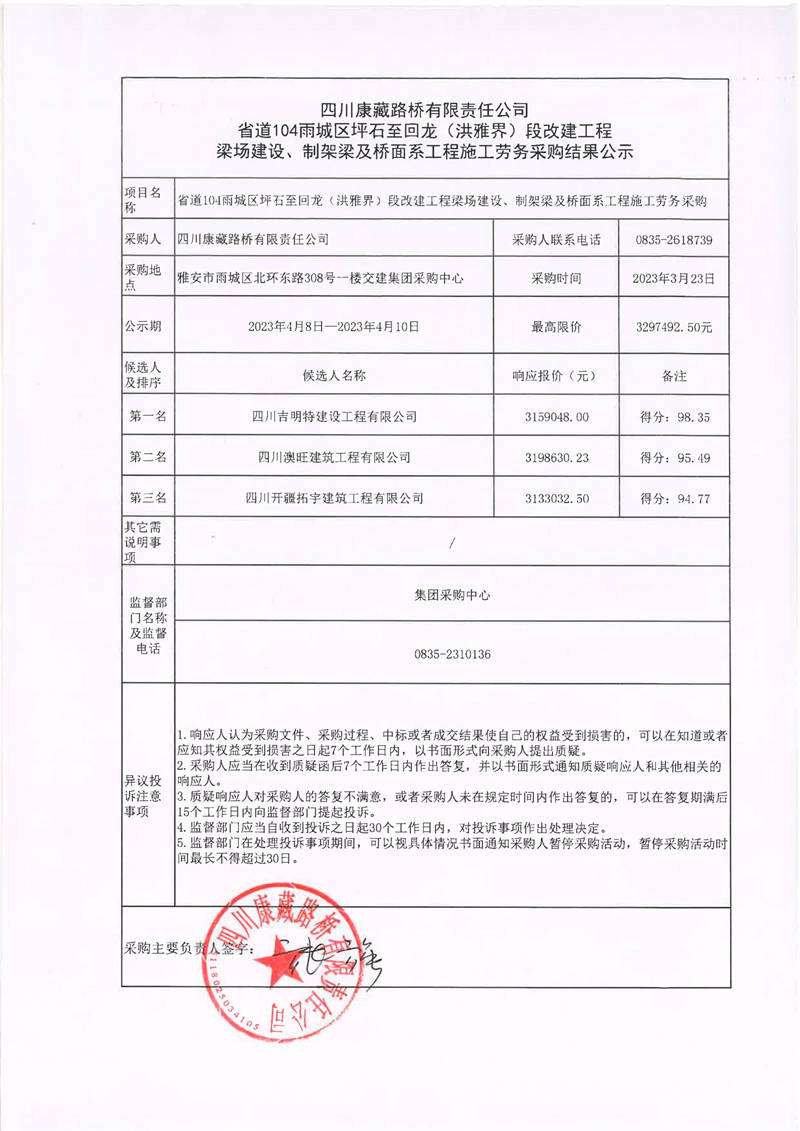 四川康藏路橋有限責(zé)任公司省道104雨城區(qū)坪石至回龍(洪雅界)段改建工程梁場建設(shè)、制架梁及橋面系工程施工勞務(wù)采購結(jié)果公示