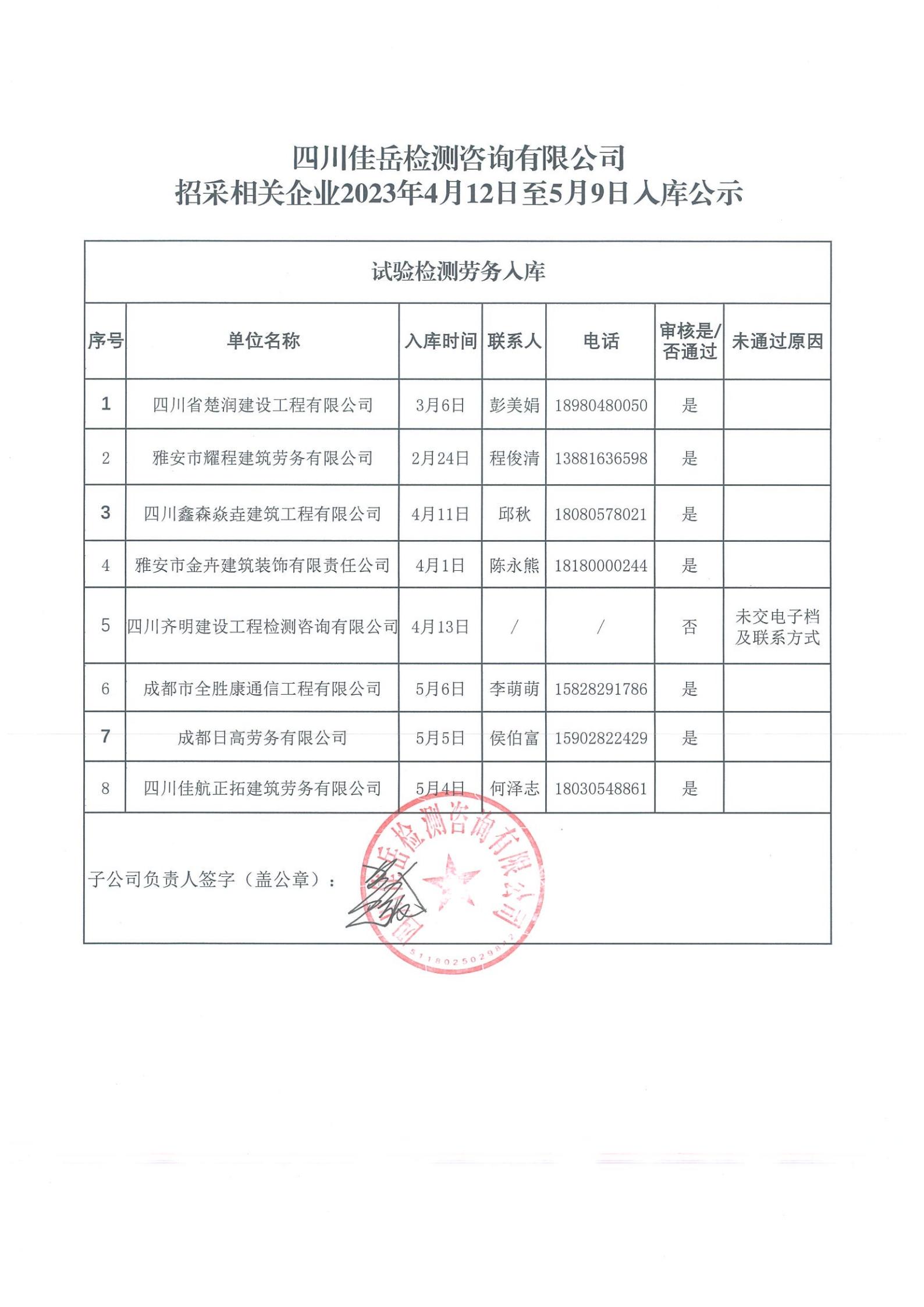 四川佳岳檢測(cè)咨詢(xún)有限公司(試驗(yàn)檢測(cè)勞務(wù)供應(yīng)商庫(kù))2023年4月12日至5月9日入庫(kù)結(jié)果公示