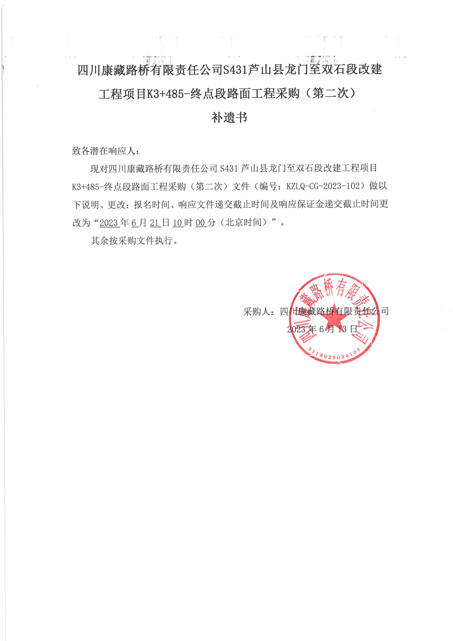 四川康藏路橋有限責(zé)任公司S431蘆山縣龍門(mén)至雙石段改建工程項(xiàng)目K3+485-終點(diǎn)段路面工程采購(gòu)(第二次)補(bǔ)遺書(shū)