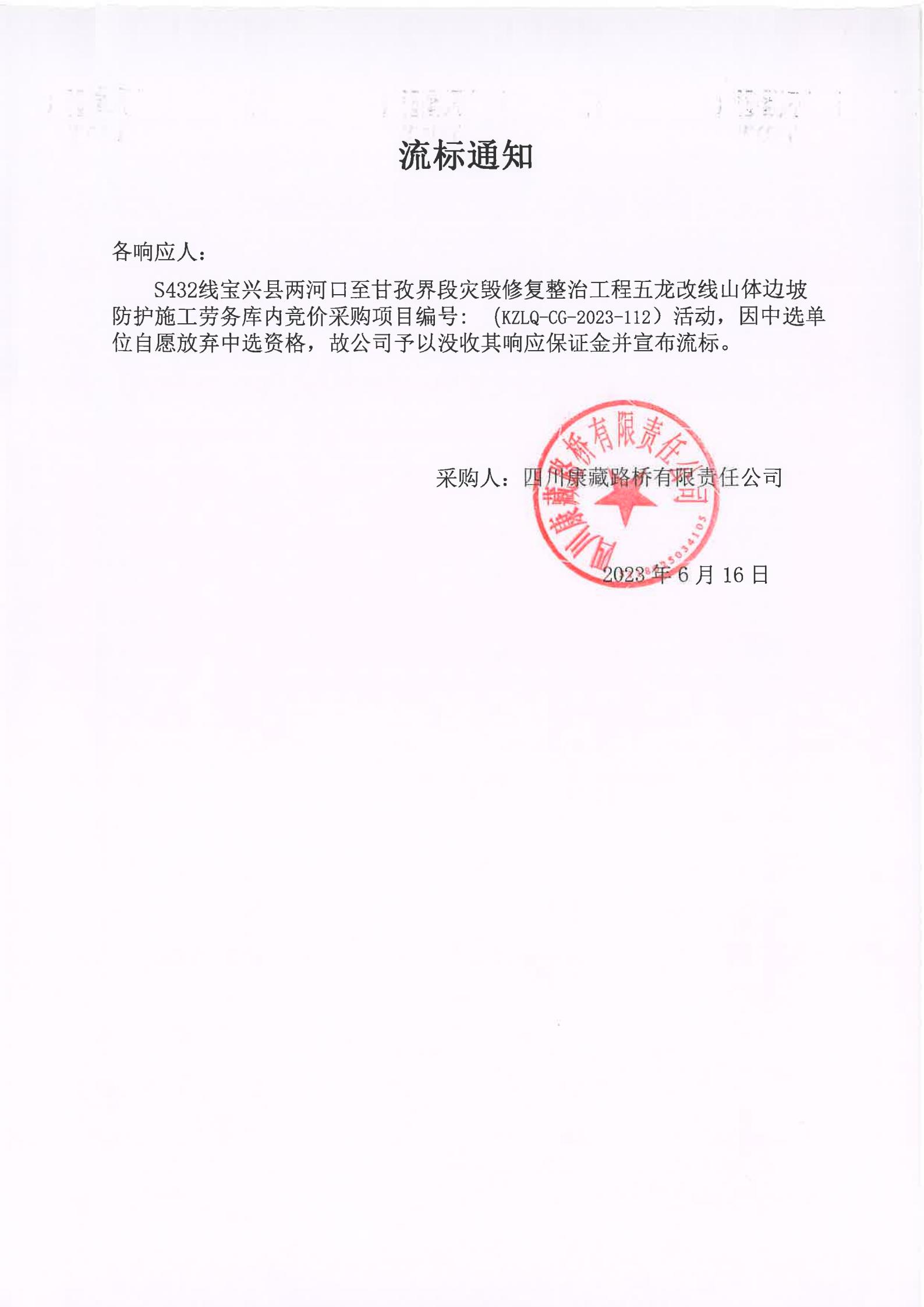 四川康藏路橋有限責(zé)任公司S432線(xiàn)寶興縣兩河口至甘孜界段災(zāi)毀修復(fù)整治工程五龍改線(xiàn)山體邊坡防護(hù)施工勞務(wù)庫(kù)內(nèi)競(jìng)價(jià)流標(biāo)通知