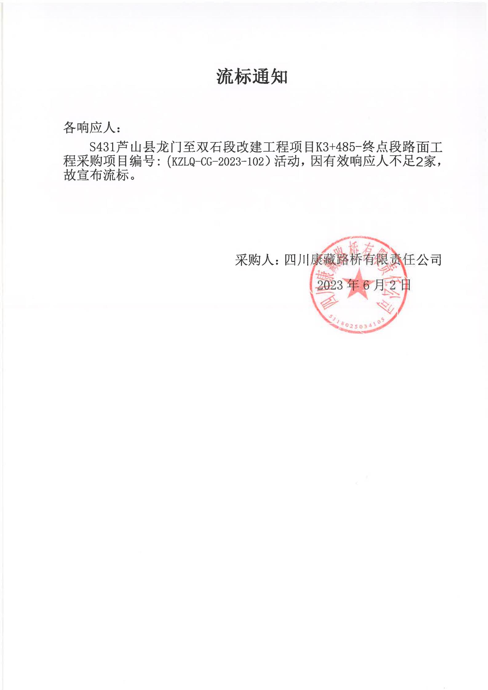 四川康藏路橋有限責(zé)任公司S431蘆山縣龍門至雙石段改建工程項(xiàng)目K3+485-終點(diǎn)段路面工程采購項(xiàng)目流標(biāo)通知