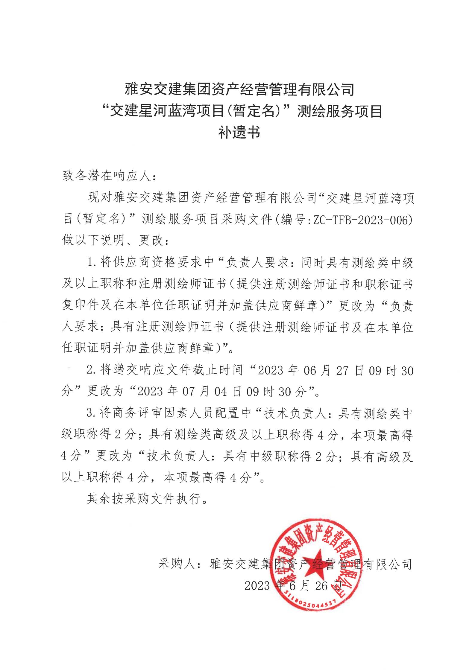 雅安交建集團(tuán)資產(chǎn)經(jīng)營管理有限公司“交建星河藍(lán)灣項(xiàng)目(暫定名)”測繪服務(wù)項(xiàng)目補(bǔ)遺書