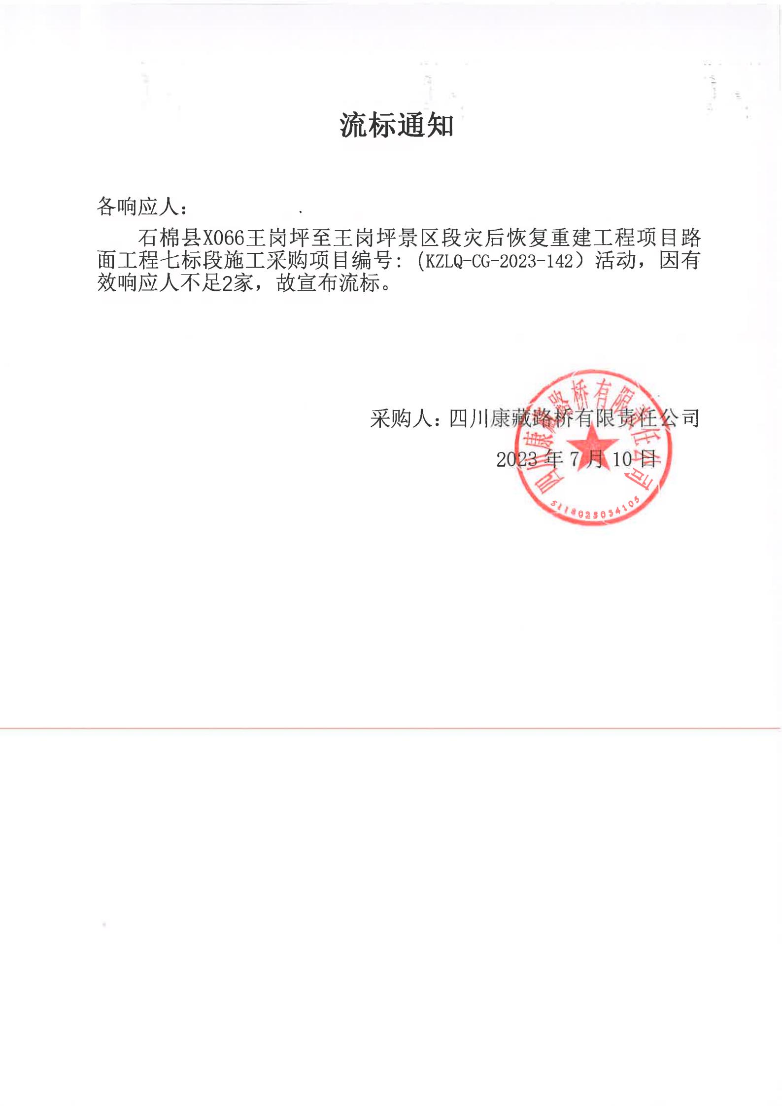 四川康藏路橋有限責(zé)任公司石棉縣X066王崗坪至王崗坪景區(qū)段災(zāi)后恢復(fù)重建工程項目路面工程七標段施工采購流標通知