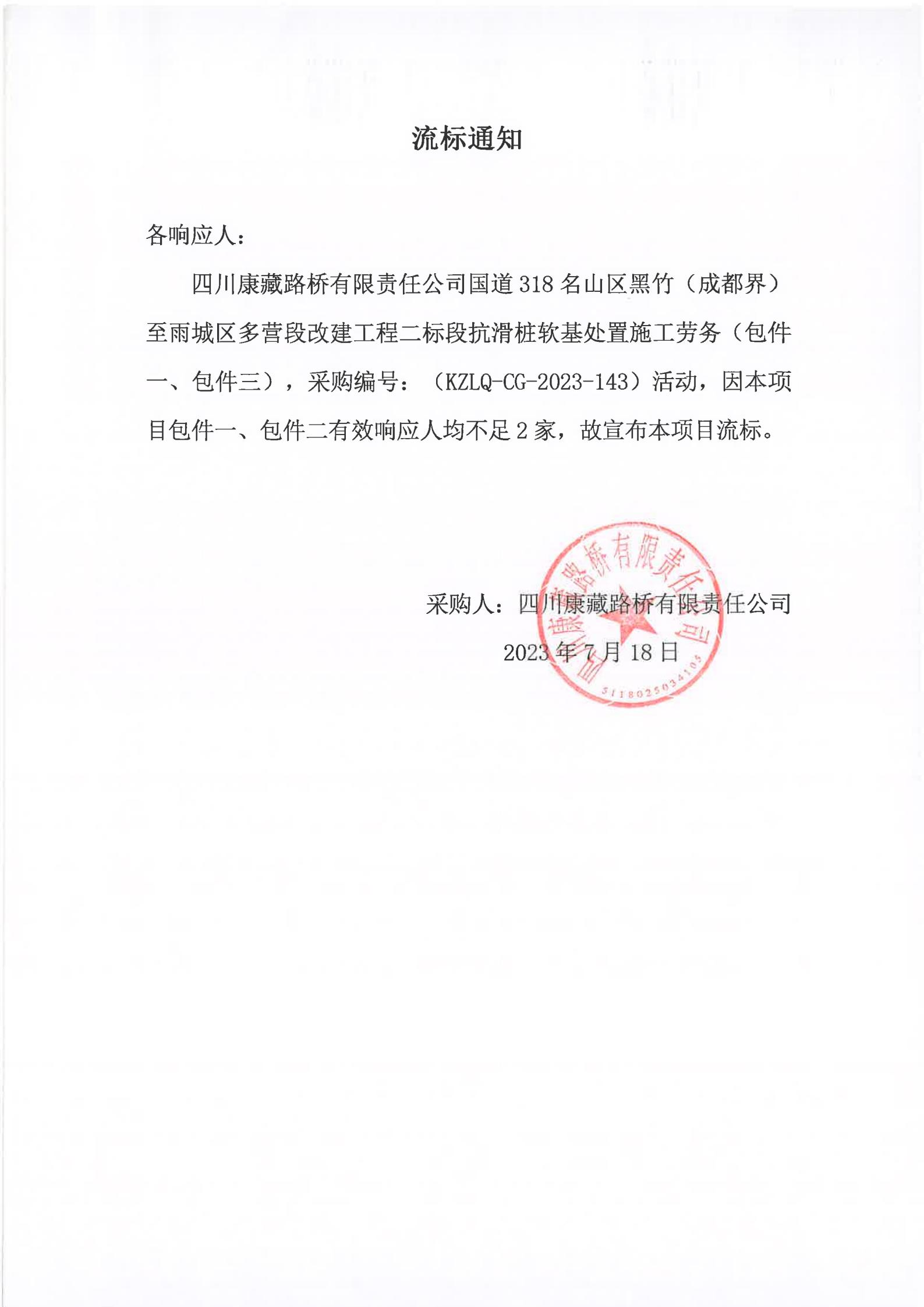 四川康藏路橋有限責任公司國道318名山區(qū)黑竹(成都界)至雨城區(qū)多營段改建工程二標段抗滑樁軟基處置施工勞務(wù)(包件一、包件三)流標通知