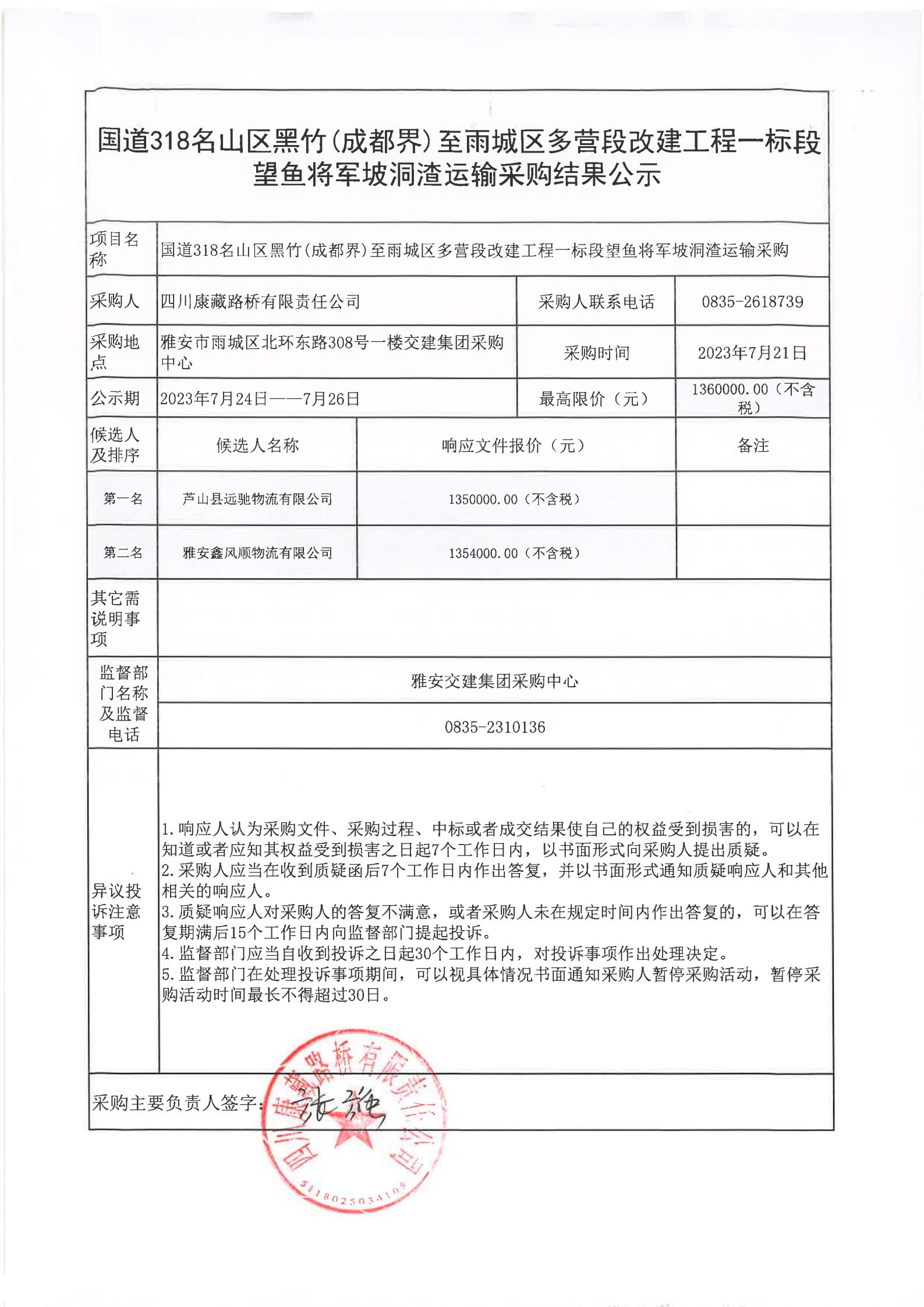四川康藏路橋有限責(zé)任公司國道318名山區(qū)黑竹(成都界)至雨城區(qū)多營段改建工程一標(biāo)段望魚將軍坡洞渣運(yùn)輸采購結(jié)果公示