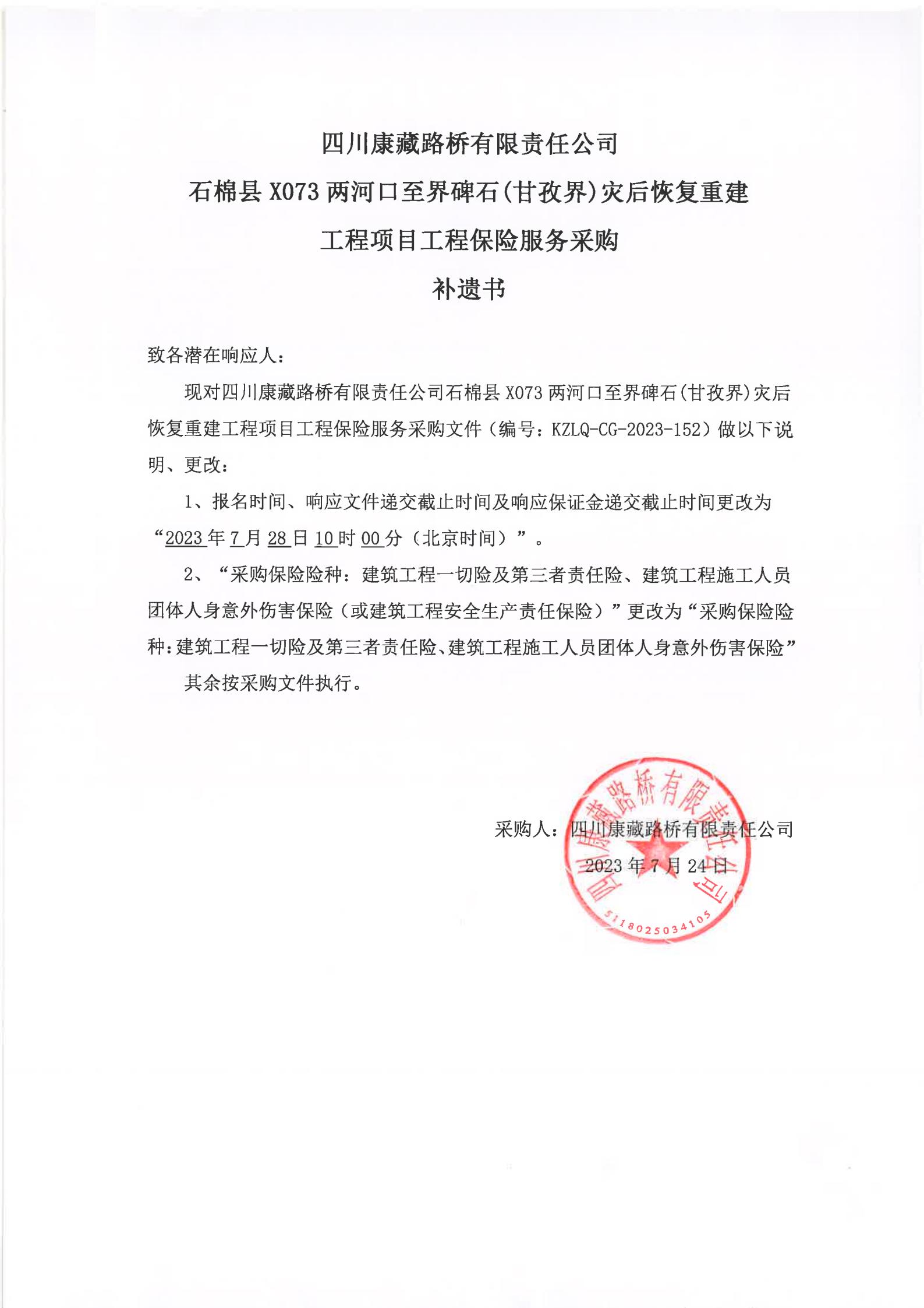四川康藏路橋有限責任公司石棉縣X073兩河口至界碑石(甘孜界)災后恢復重建工程項目工程保險服務采購補遺書