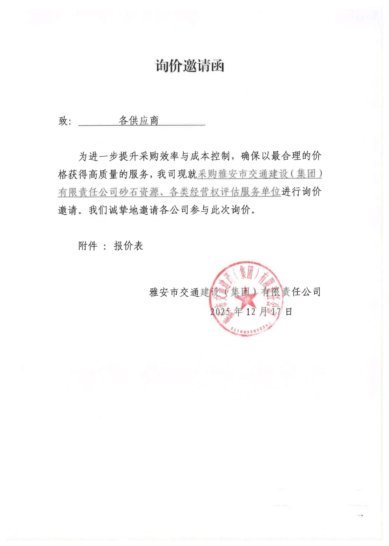 關(guān)于雅安市交通建設(shè)(集團(tuán))有限責(zé)任公司砂石資源、各類(lèi)經(jīng)營(yíng)權(quán)評(píng)估服務(wù)限價(jià)的詢(xún)價(jià)函