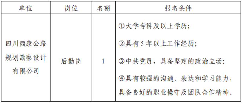 根據發(fā)展需要,決定面向社會公開招聘雅安市交通建設(集團)有限責任公司(以下簡稱“雅安交建集團”)所屬子公司綜合辦公室后勤崗1名,現(xiàn)將有關事項公告如下: