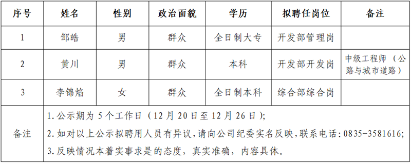 雅安交建集團大興交通開發(fā)有限公司擬聘用人員公示