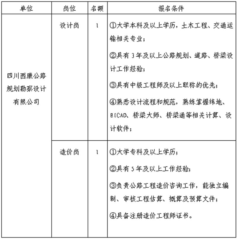 根據(jù)發(fā)展需要,決定面向社會公開招聘雅安市交通建設(shè)(集團)有限責(zé)任公司(以下簡稱“雅安交建集團”)所屬子公司工作人員2名,現(xiàn)將有關(guān)事項公告如下: