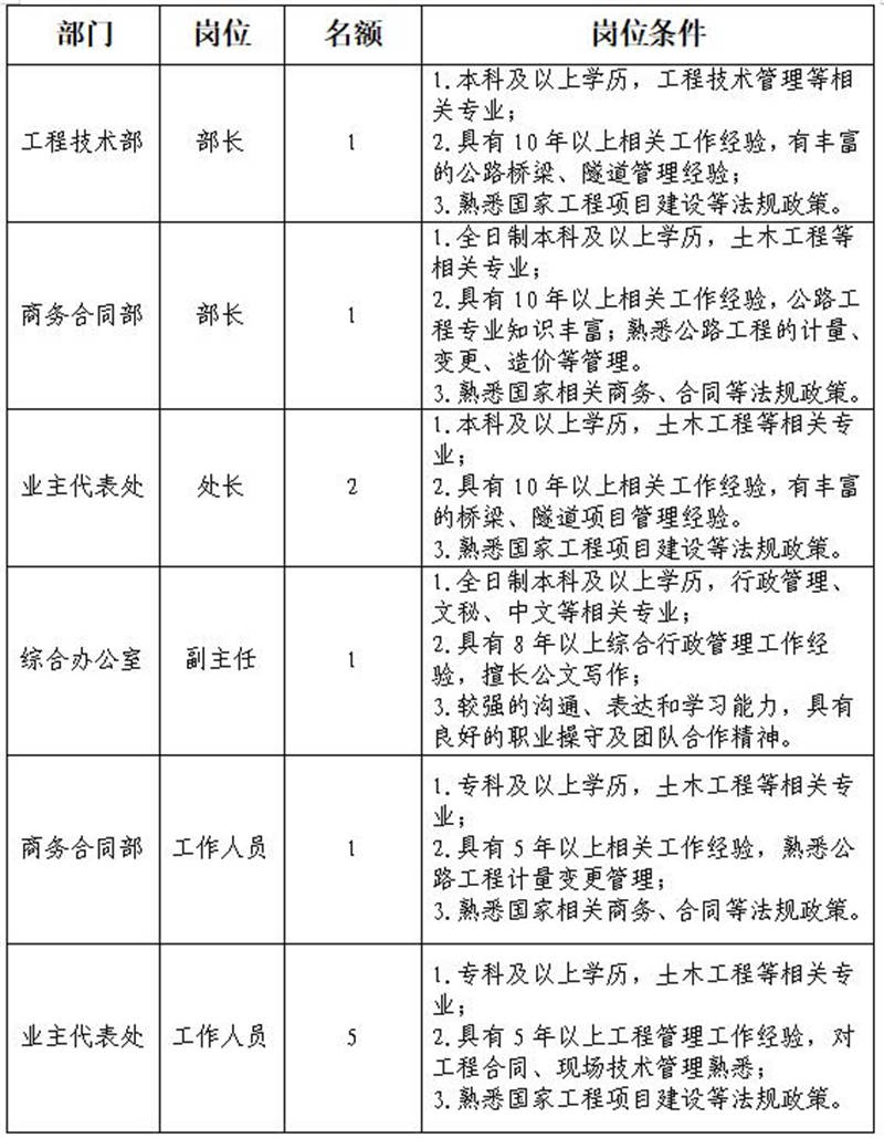 根據(jù)發(fā)展需要,決定面向社會公開招聘雅安市交通建設(集團)有限責任公司(以下簡稱“雅安交建集團”)所屬子公司管理人員及工作人員共計11名,現(xiàn)將有關事項公告如下: