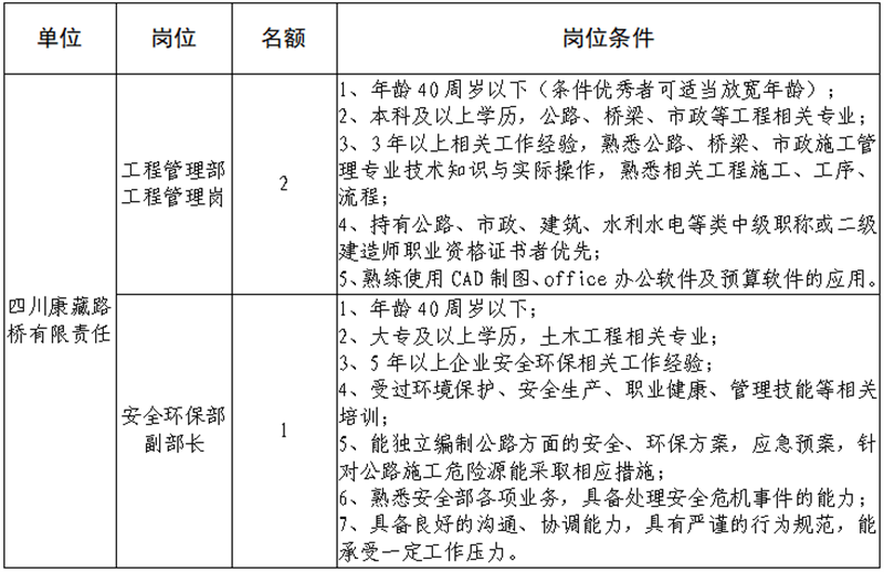 根據(jù)發(fā)展需要,決定面向社會公開招聘雅安市交通建設(集團)有限責任公司(以下簡稱“雅安交建集團”)所屬子公司相關人員3名,現(xiàn)將有關事項公告如下: