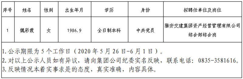根據雅安市交通建設(集團)有限責任公司招聘公告,經公開報名、資格初審、筆試、面試、體檢考察等環(huán)節(jié),現將以下1名擬聘用人員予以公示: