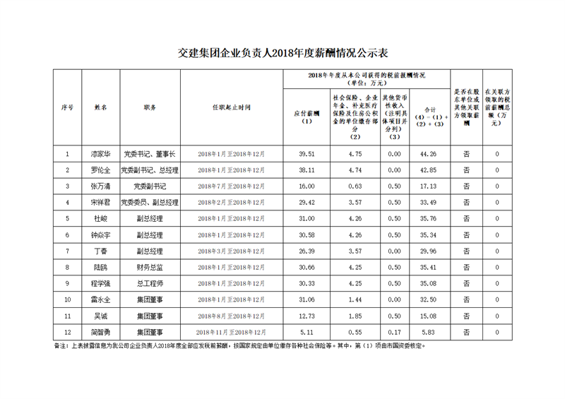 交建集團企業(yè)負責(zé)人2018年度薪酬情況公示表