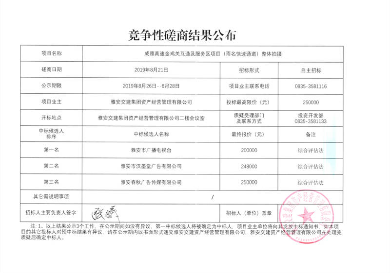成雅高速金雞關(guān)互通及服務(wù)區(qū)項(xiàng)目(雨名快速通道)整體拍攝競爭性磋商結(jié)果公布