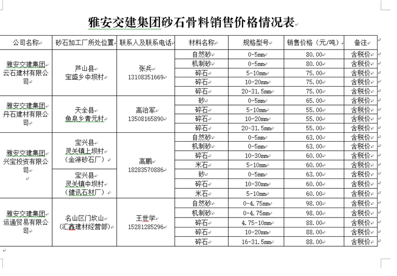 四、運(yùn)通貿(mào)易有限公司。運(yùn)通公司是雅安市交通建設(shè)(集團(tuán))有限責(zé)任公司獨(dú)資子公司,主要負(fù)責(zé)雨城區(qū)中心城區(qū)河道外砂石經(jīng)營管理工作。目前,公司與兩家企業(yè)確定了代加工合作關(guān)系:一是名山區(qū)匯鑫建材經(jīng)營部,該企業(yè)位于名山區(qū)門坎山,已投產(chǎn);二是雅安市名山區(qū)雙飛化工商貿(mào)有限公司該公司位于名山區(qū)馬鞍山,已具備生產(chǎn)加工能力;預(yù)計(jì)年生產(chǎn)能力約80萬噸。