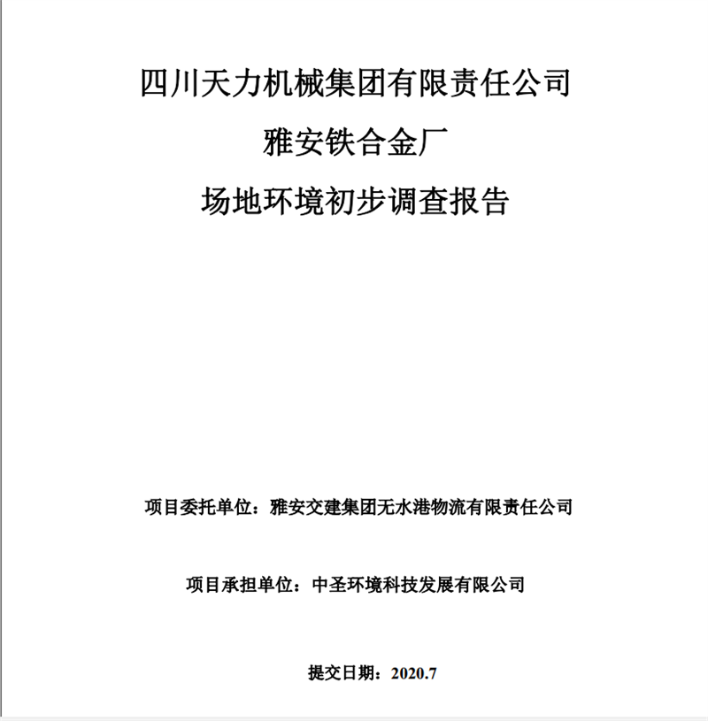 四川天力機械集團(tuán)有限責(zé)任公司——雅安鐵合金廠場地環(huán)境初步調(diào)查報告