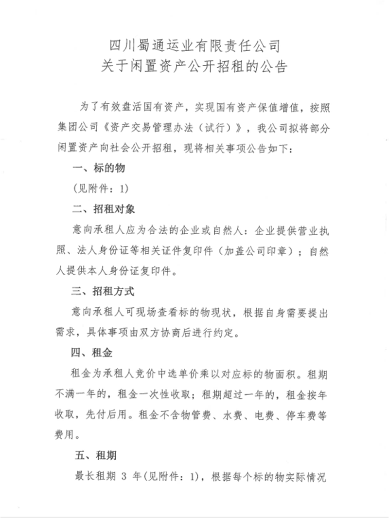 蜀通運業(yè)有限責(zé)任公司關(guān)于閑置資產(chǎn)公開招租的公告附件