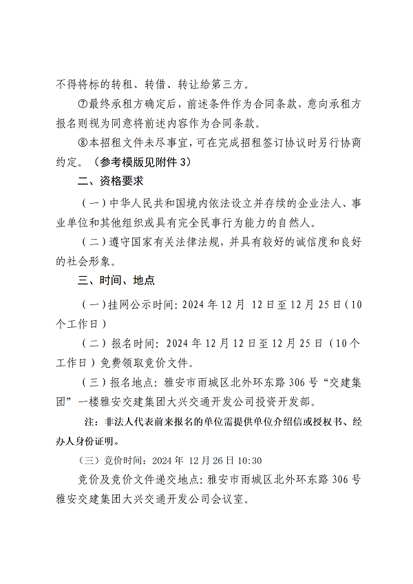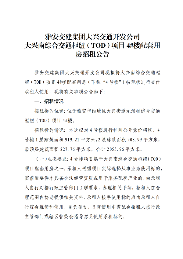 雅安交建集團大興交通開發(fā)公司大興南綜合交通樞紐(TOD)項目4#樓配套用房招租公告