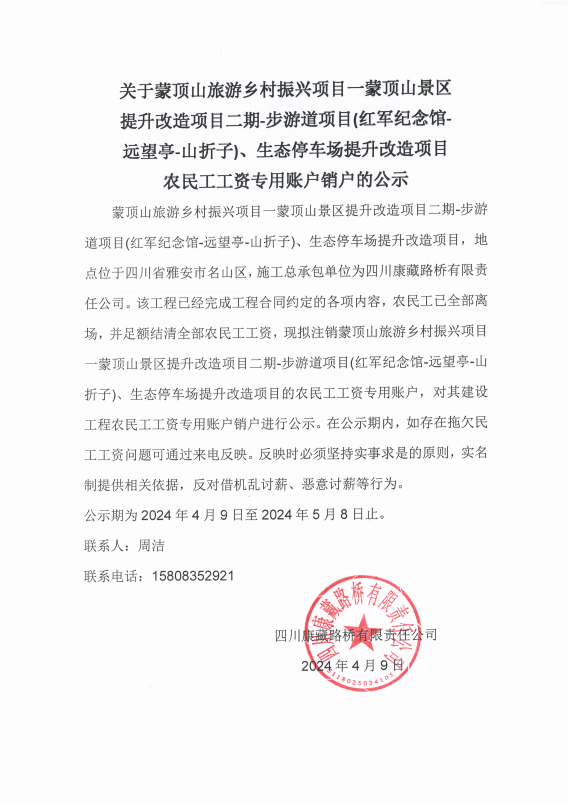 關(guān)于蒙頂山旅游鄉(xiāng)村振興項(xiàng)目一蒙頂山景區(qū)提升改造項(xiàng)目二期-步游道項(xiàng)目(紅軍紀(jì)念館遠(yuǎn)望亭-山折子)、生態(tài)停車場(chǎng)提升改造項(xiàng)目農(nóng)民工工資專用賬戶銷戶的公示
