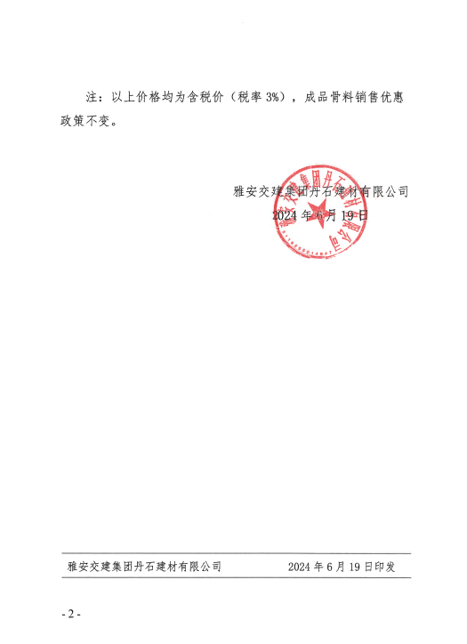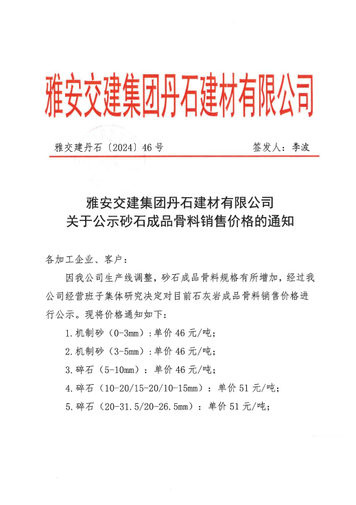 關于公示砂石成品骨料銷售價格的通知