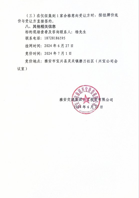 雅安交建集團(tuán)興寶投資有限公司寶興縣靈關(guān)鎮(zhèn)代碑寺土地整理項目10萬噸可利用棄渣競價銷售公告(2024.6.21)