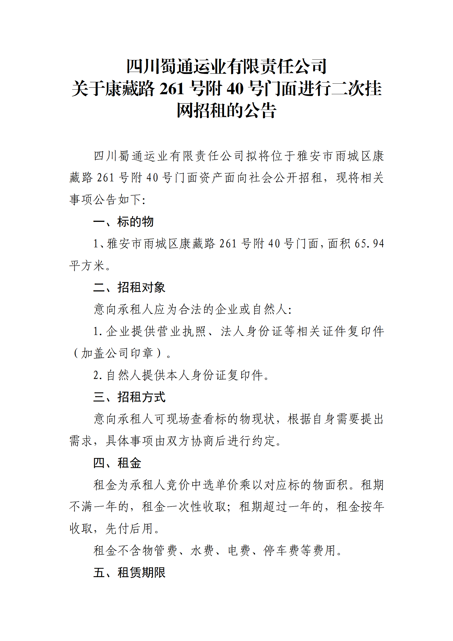 四川蜀通運(yùn)業(yè)有限責(zé)任公司 關(guān)于康藏路261號附40號門面進(jìn)行二次掛網(wǎng)招租的公告
