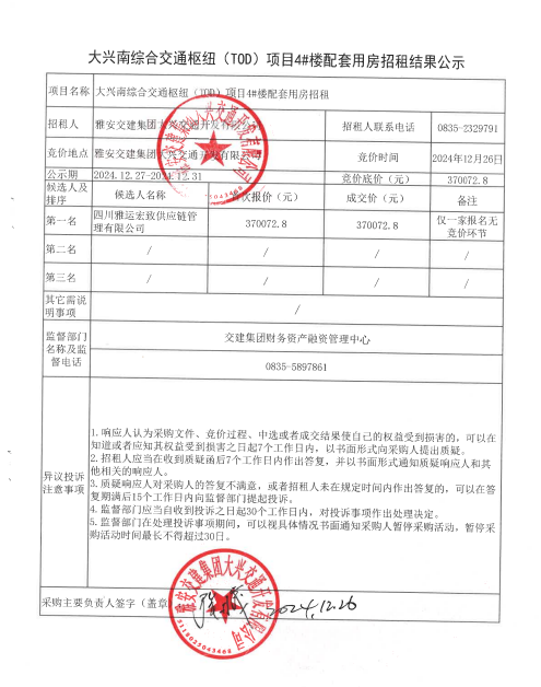 大興南綜合交通樞紐(TOD)項(xiàng)目4#樓配套用房招租結(jié)果公示