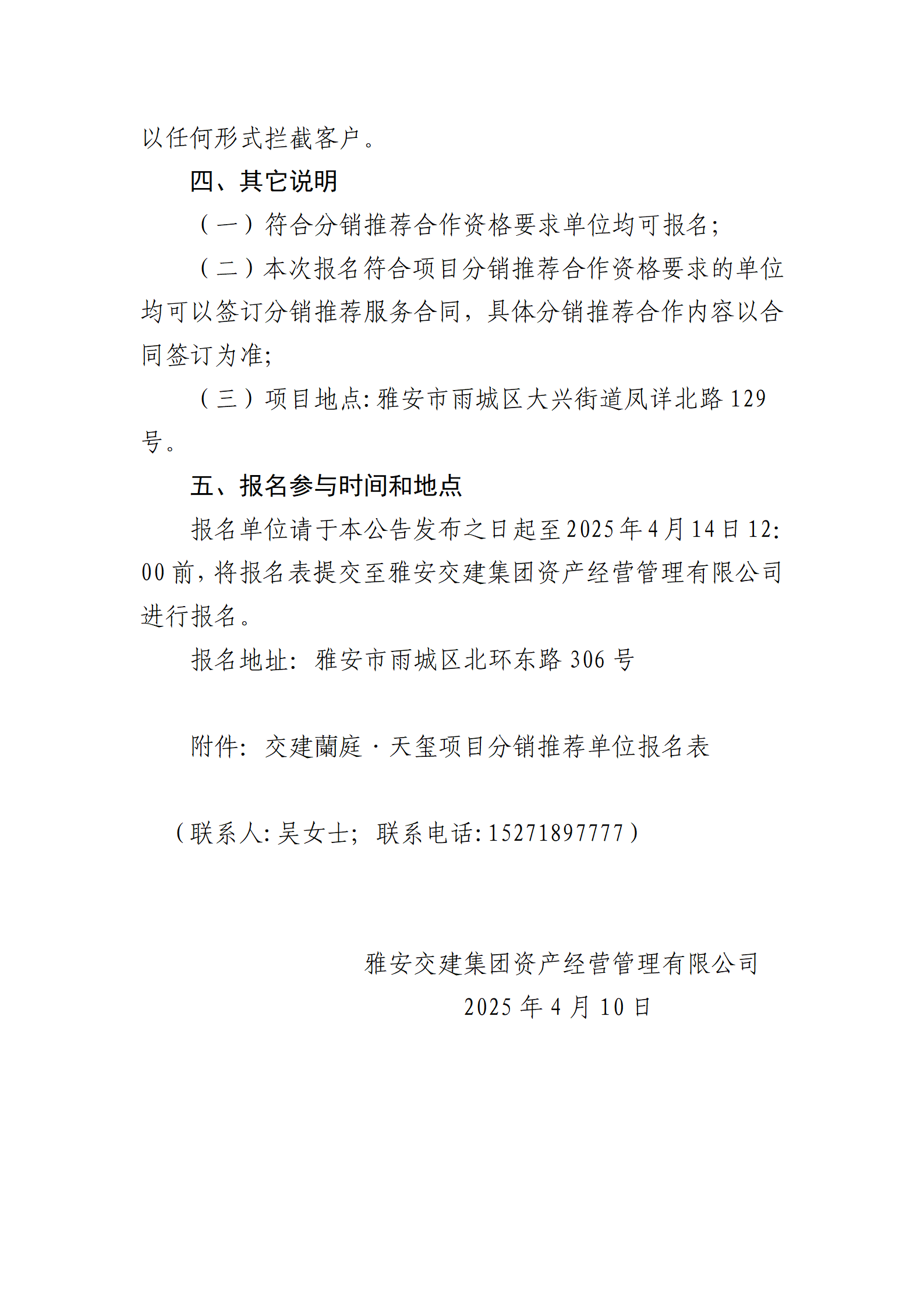 雅安交建集團(tuán)資產(chǎn)經(jīng)營(yíng)管理有限公司 關(guān)于征集蘭庭·天璽項(xiàng)目分銷(xiāo)推薦合作單位的公告