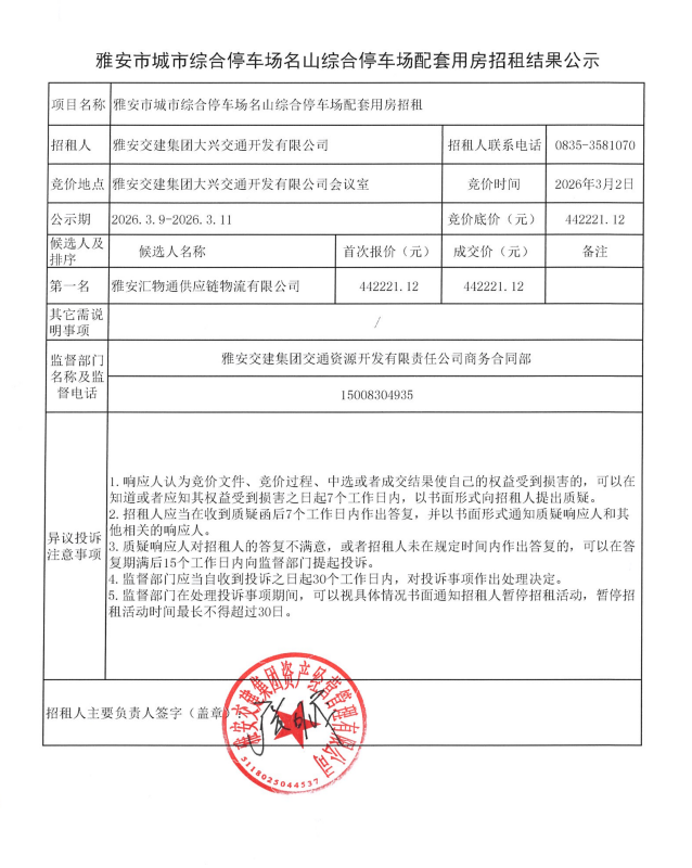 雅安市城市綜合停車(chē)場(chǎng)名山綜合停車(chē)場(chǎng)配套用房招租結(jié)果公示